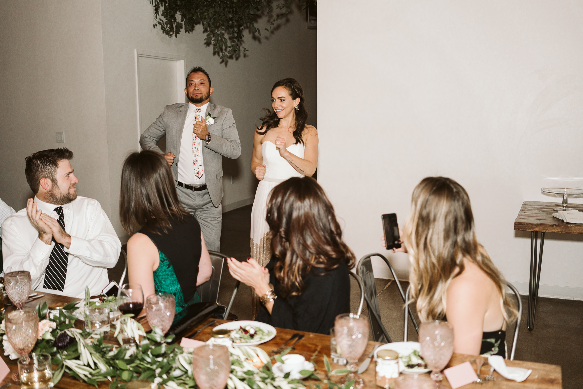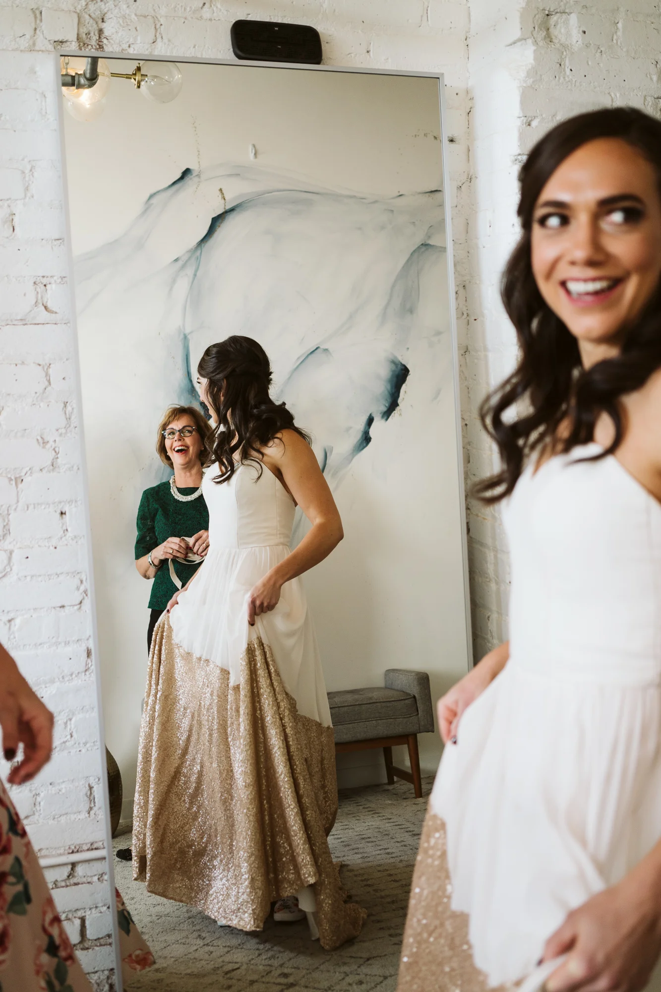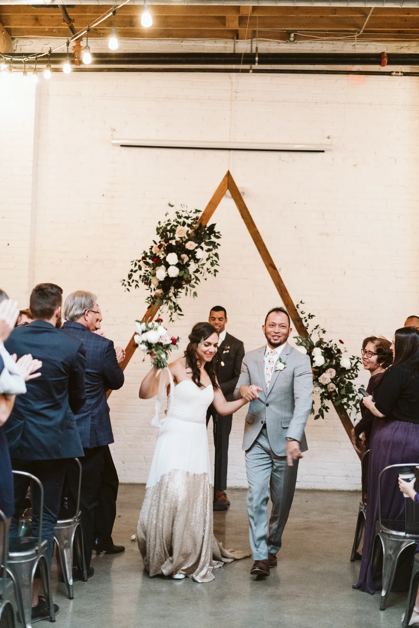 Joel and Kaci said “I do” at Skylight in Denver Colorado’s art district, surrounded by friends, family, and lots of groovy tunes! Their day was nonstop fun, which wasn’t a surprise to those who know this amazing couple. You can’t help but have a blast with two people who won’t stop smiling or dancing. It’s so clear that they were meant to be together. The details of this wedding were gorgeous - a rose gold sequined wedding dress, a macaron tower, a donut wall, and an A-frame altar built by the groom himself.
